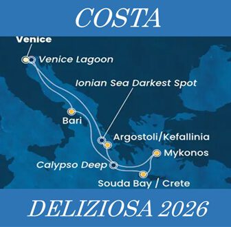 2026年夏のCOSTA DELIZIOSAは2コース用意されております。こちらは人気のギリシャ島々を巡るコースです。2010年にデビューしたコスタデリチョーザは最先端の…