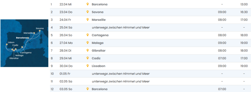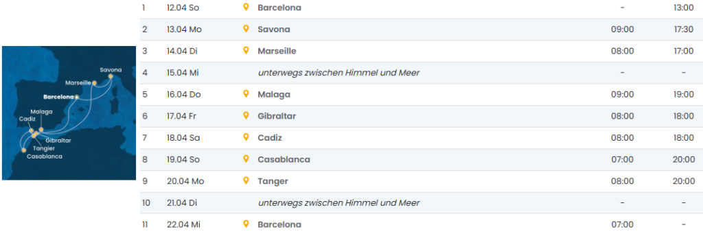 ポルトガルやモロッコなどに寄港する少し長めのクルーズです。
