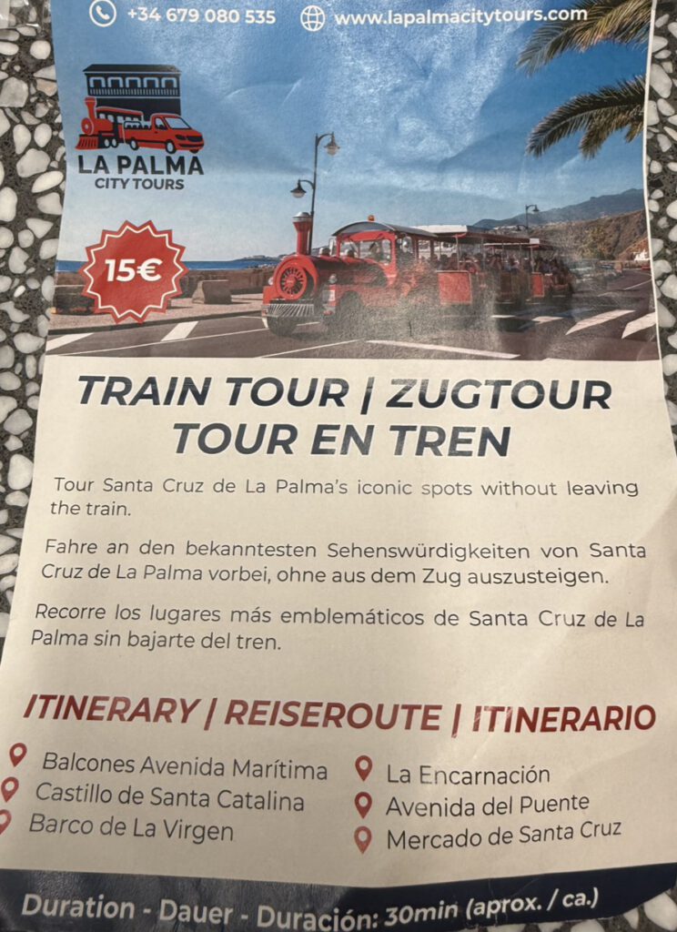 サンタ・クルス・デ・ラ・パルマの主要スポットを、観光トレインに乗ったまま巡るシティツアーです。歩かずに市内の見どころを効率よく楽しめます。