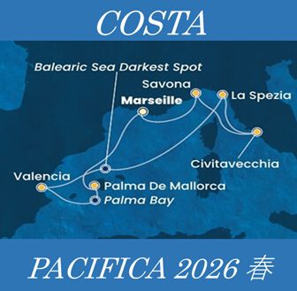 欧米人のハワイ的な感覚のスペイン マヨルカ島へ寄り 春のバカンスを楽しめるコースです!ラ・スペツィアからピサやフィレンツェへ。COSTA パシフィカの船内…